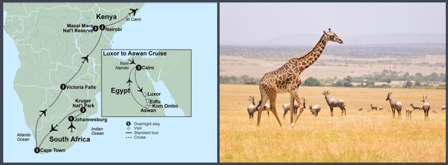 Track the Big 5 in Kenya and South Africa, cruise the Nile, and stand in awe before wonders from Victoria Falls to the Pyramids. Begin in South Africa, where thrilling safaris in Kruger and panoramic views from Cape Town’s Table Mountain await. In Zimbabwe, feel the spray of Victoria Falls and cruise the Zambezi at sunset. Continue to Kenya’s Maasai Mara for immersive game drives and wildlife encounters on the open plains. Then, journey north to Egypt to explore the Pyramids of Giza, cruise the Nile past ancient temples, and connect with the past at Karnak, Kom Ombo, and Philae. From vibrant cities to untamed wilderness, this journey across Africa blends iconic sights, cultural connections, and unforgettable wildlife encounters.