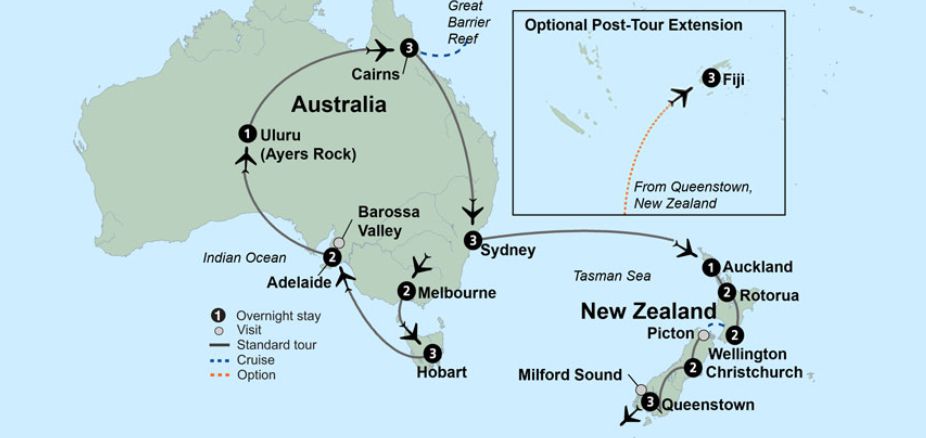 Cross the International Dateline as you begin a comprehensive adventure through Australia and New Zealand. You’ll earn your world traveller reputation with each spectacular place you reach. Be prepared for some extensive travel days between the destinations on your tour.