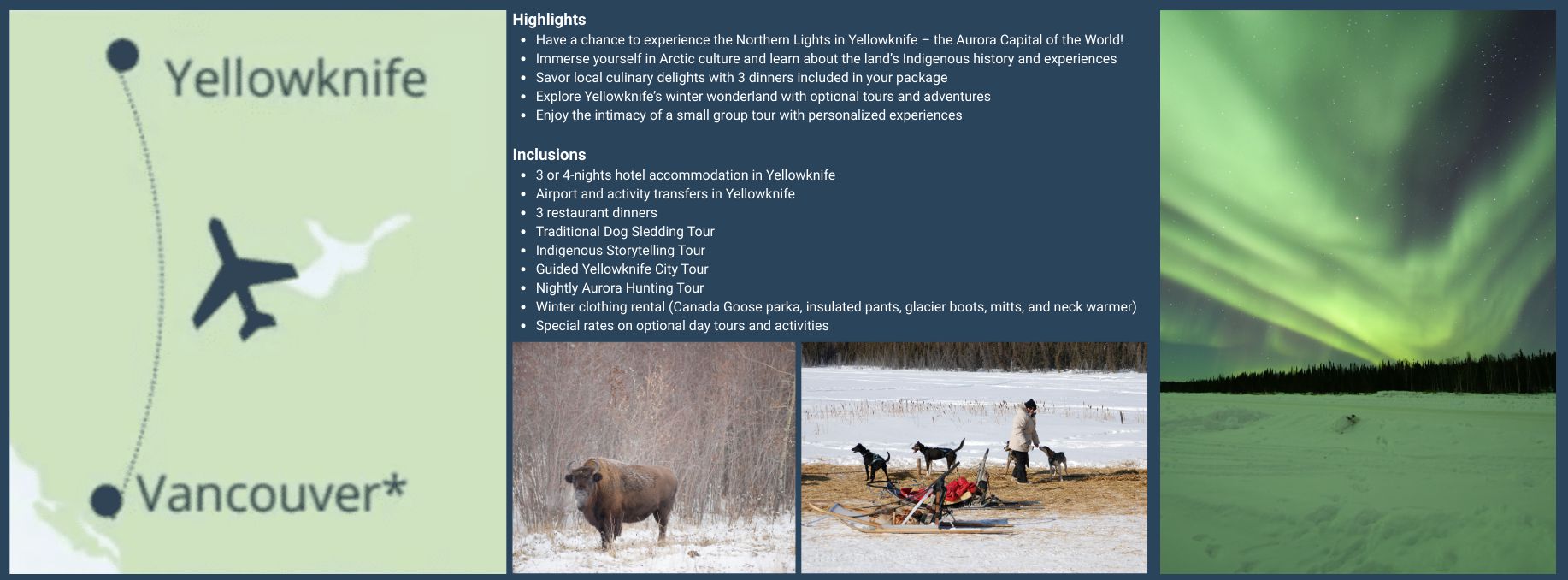 Experience the magic of Yellowknife on this 4 or 5-day adventure, where you’ll chase the Aurora* in one of the best places on Earth to witness this natural wonder. The Northwest Territories offer the perfect conditions for viewing the Northern Lights up to 240 nights a year! Enjoy a small group setting on this trip as you explore Yellowknife’s cultural heritage, including a traditional dog sledding tour, and an Indigenous storytelling experience. With comfortable accommodations, delicious local dining, and the thrill of Aurora hunting each night, this adventure promises an unforgettable Arctic journey.